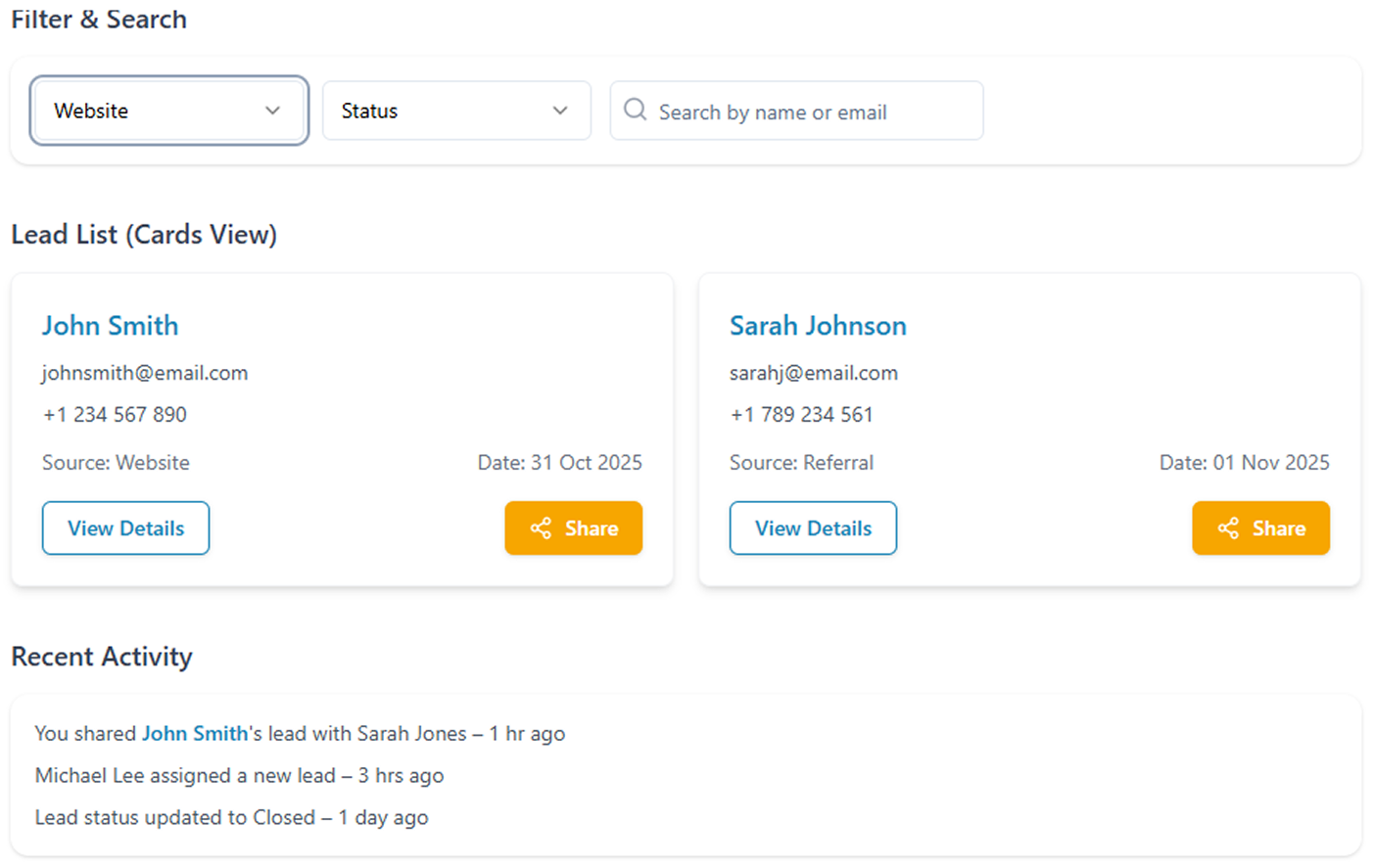Track shared leads in real time and monitor progress across teams, ensuring timely follow-ups and improved conversions.